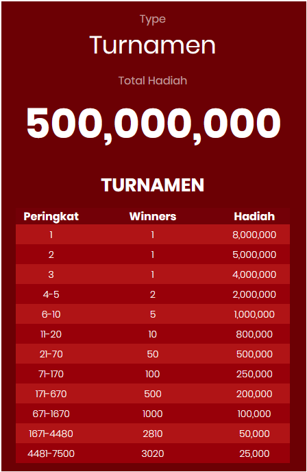 4. Sebanyak 7.500 pemenang akan mendapatkan hadiah senilai Rp 500.000.000 yang akan dipilih secara acak dalam turnamen ini.
